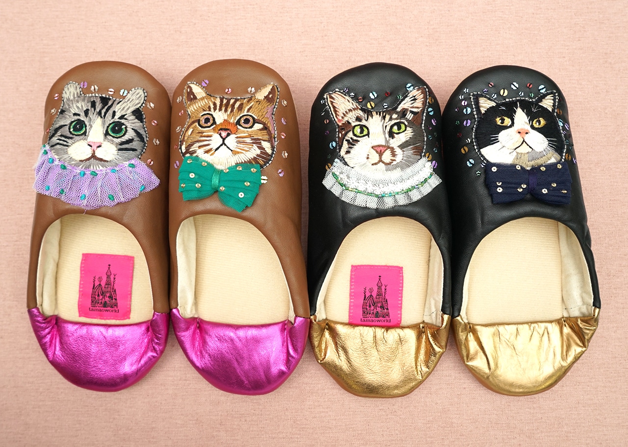元々はメタリックネイビーとメタリックグリーンのお色で販売しておりました猫ちゃんルームシューズに、今回、こちらのブラウンver.とブラックver.も新登場です✨