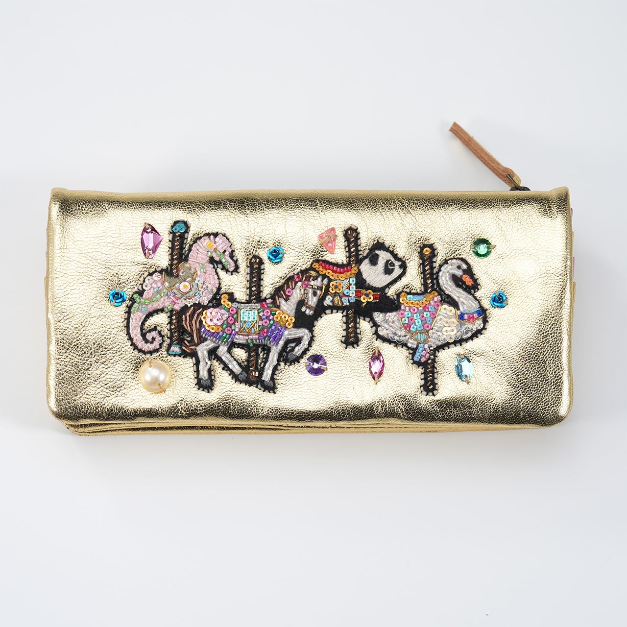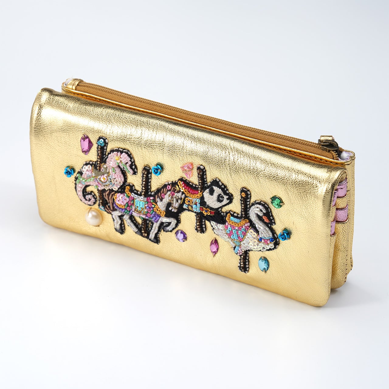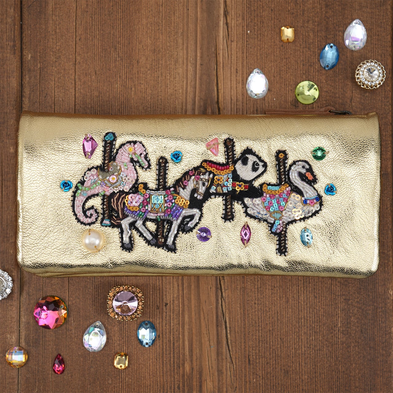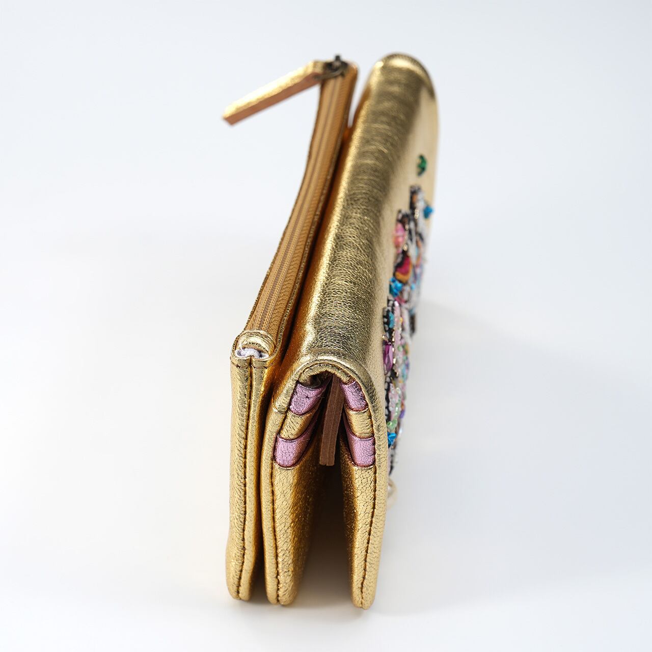 プリントの上を塗り絵のように刺繍する技法で作られたユニークな長財布です。柔らかい羊革に1点1点刺繍職人が丁寧に手刺繍を施しています。
