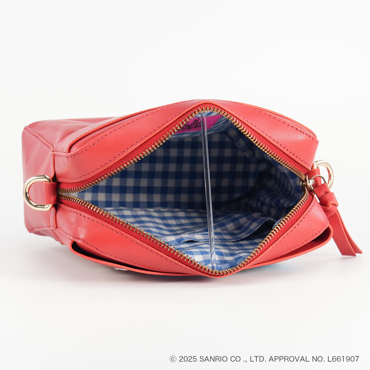 It features three compartments: the main opening plus additional pockets on the front and back, offering both style and functionality. The inner lining is made of cute gingham check fabric.