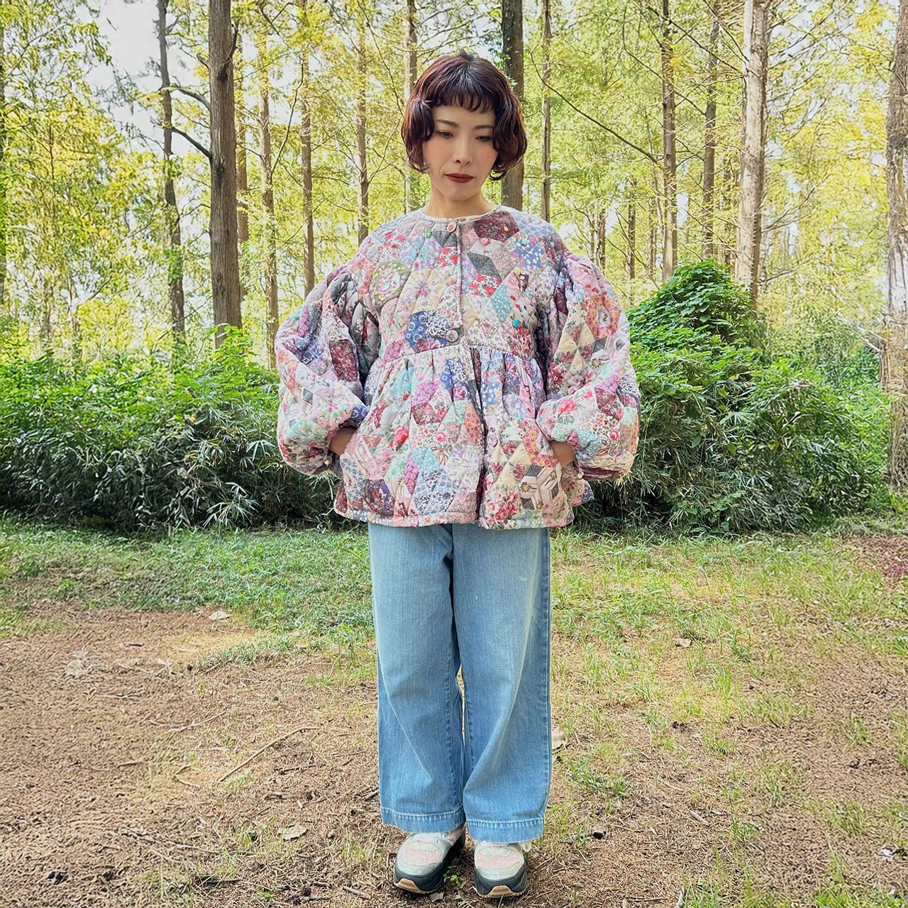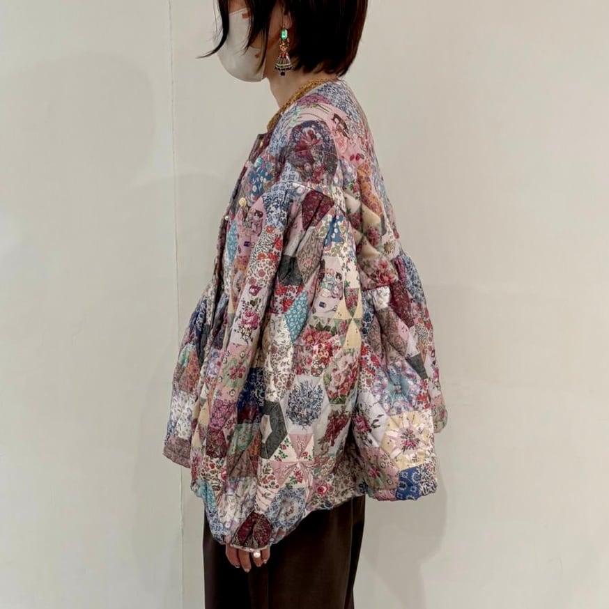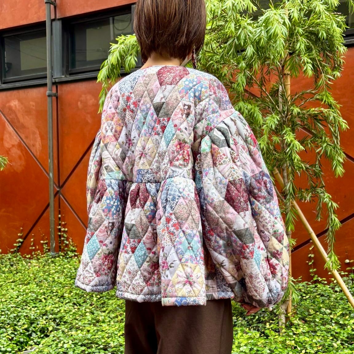 オリジナルのパッチワーク風デザインが印象的なキルティングコート。羽織るだけでスタイリングが華やぎます。