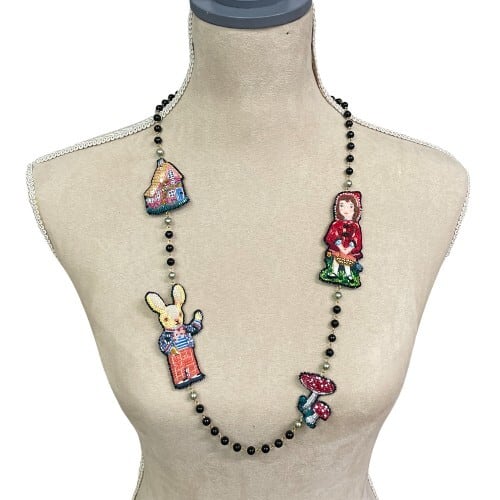 This necklace is a special collaboration with French artist Nathalie Lété, featuring embroidered motifs inspired by her charming Little Red Riding Hood illustrations.