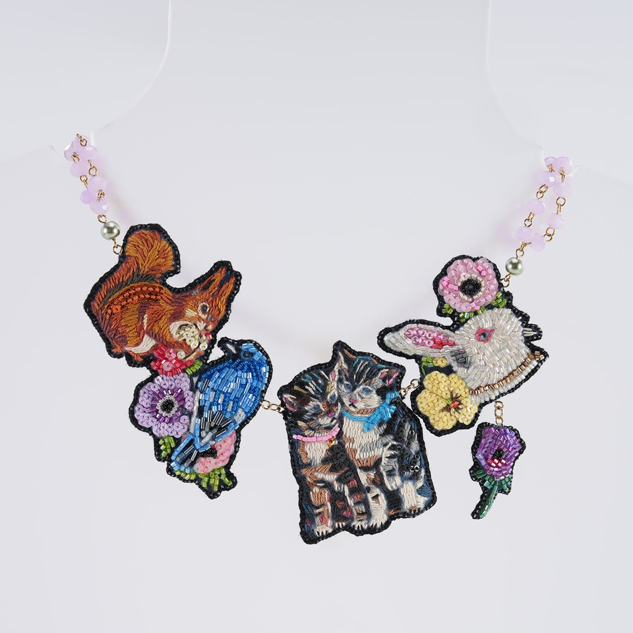 フランス人女性のアーティスト、Nathalie Leteとのコラボレーションネックレス。ナタリーが描いたさまざまなアニマルモチーフたちを刺繍で再現しています。