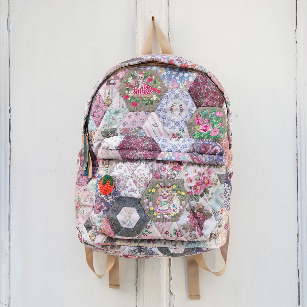 オリジナルのパッチワークプリント生地を贅沢に使用したキルティングバックパック。