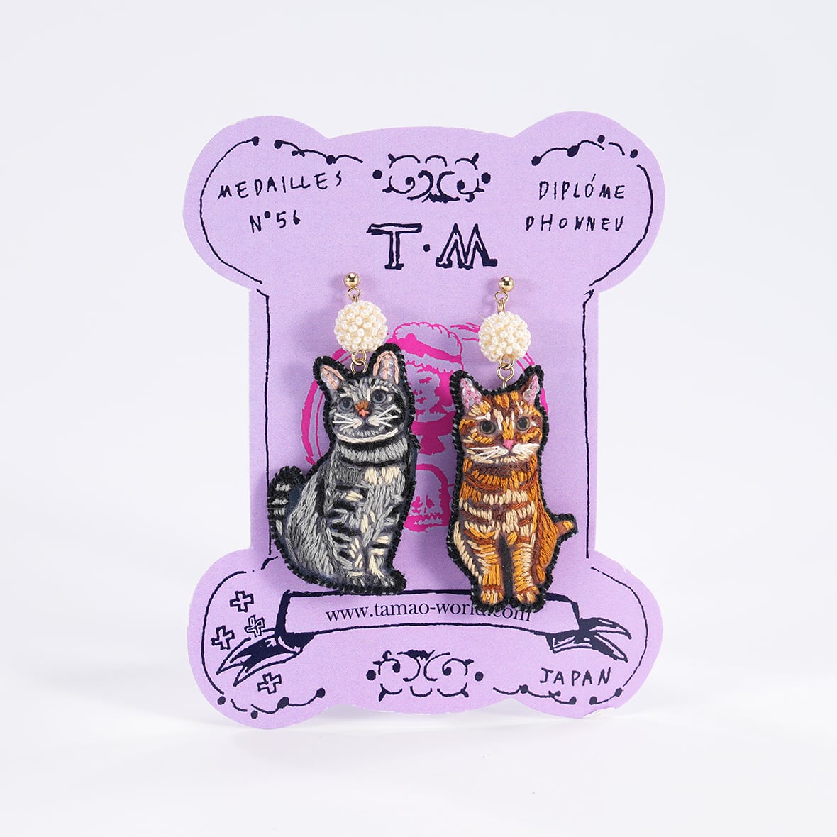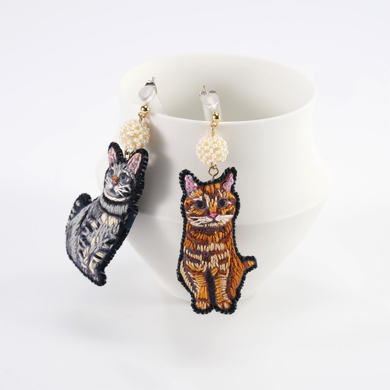 刺繍ピアス / 刺繍イヤリング Tabby cat