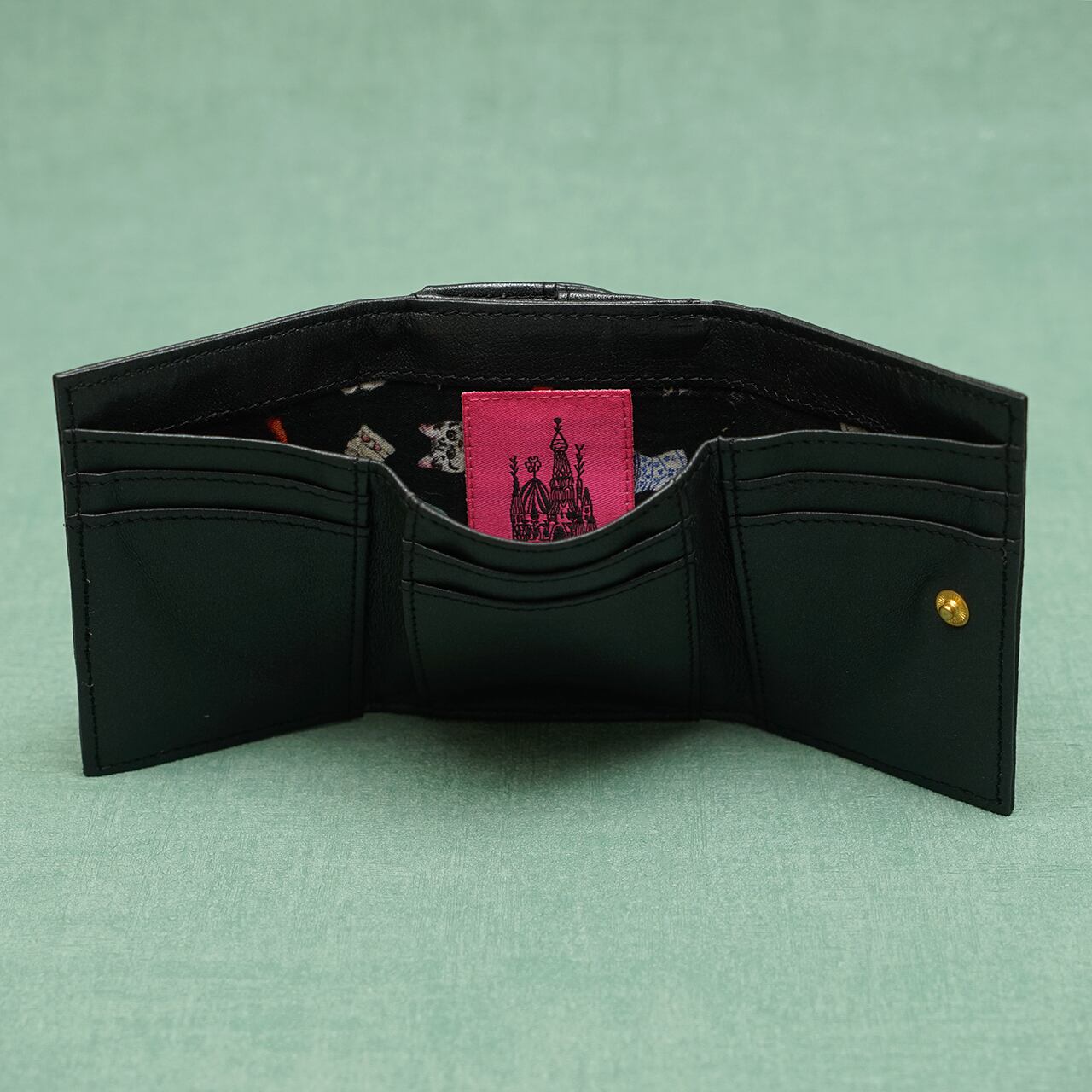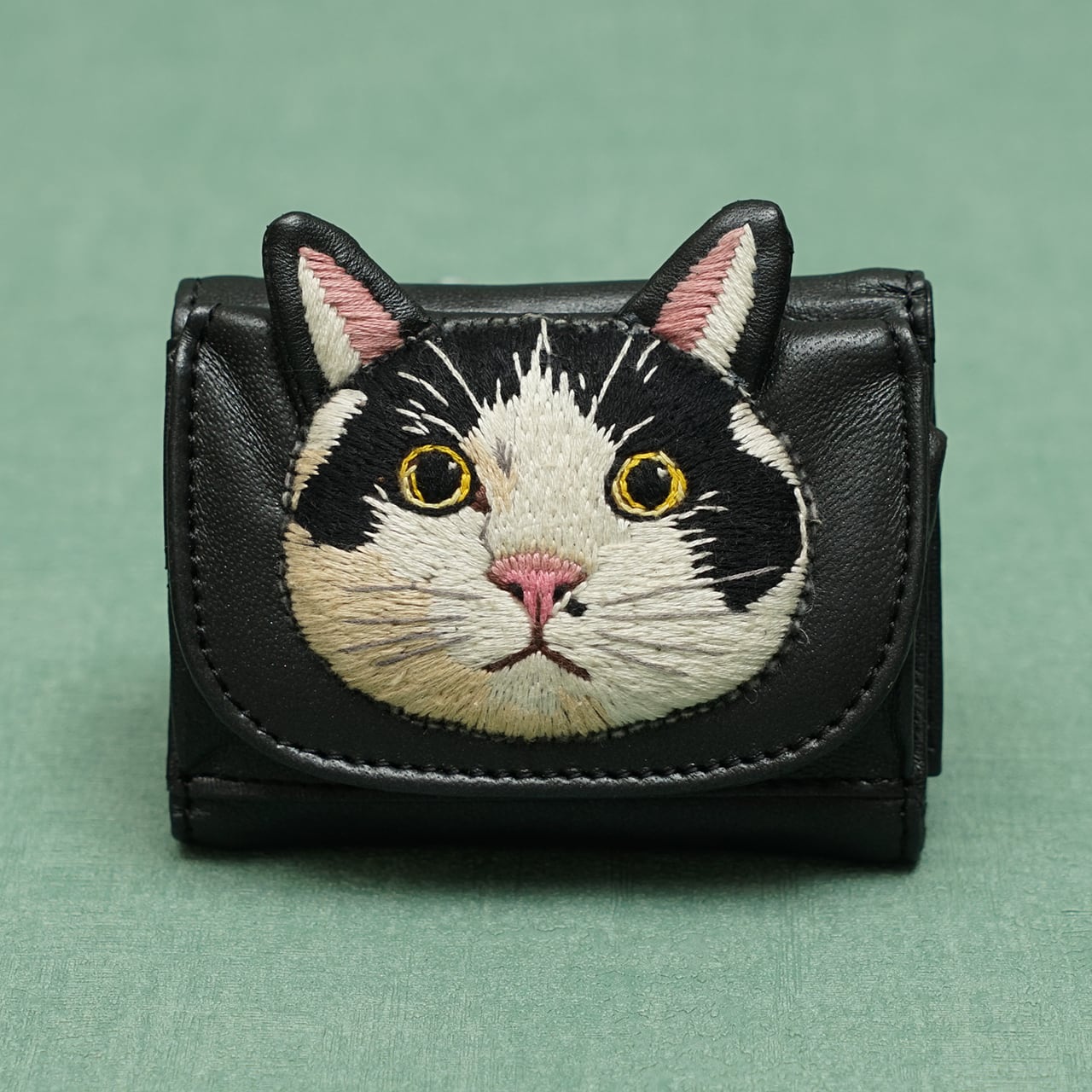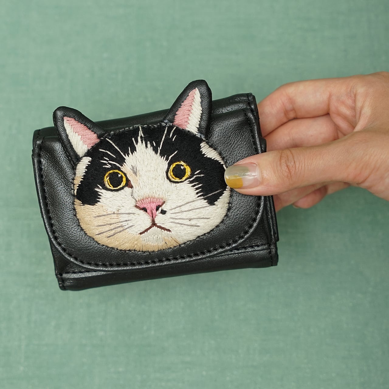 Mini wallet with the cat embroidery on the soft sheep leather.