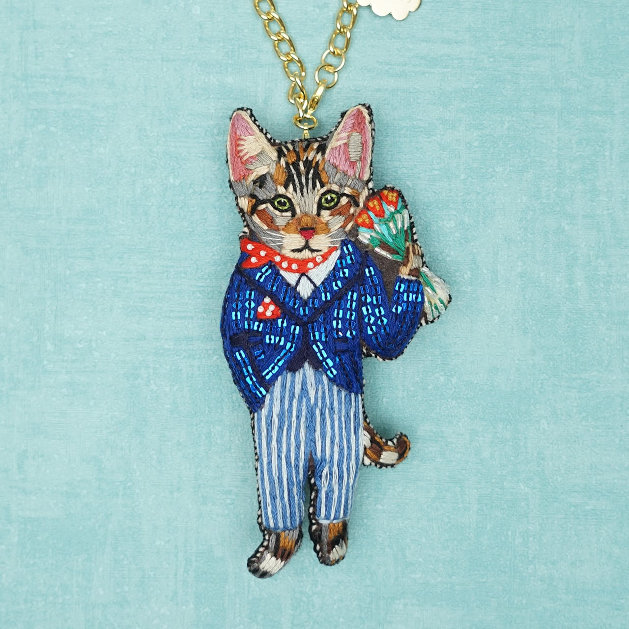 刺繍チャームブローチ Nathalie Lété Bouquet of flowers and a cat