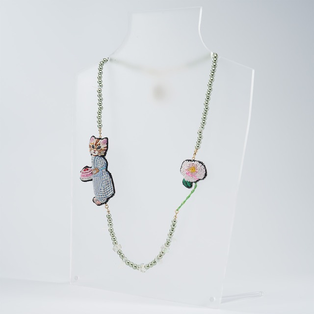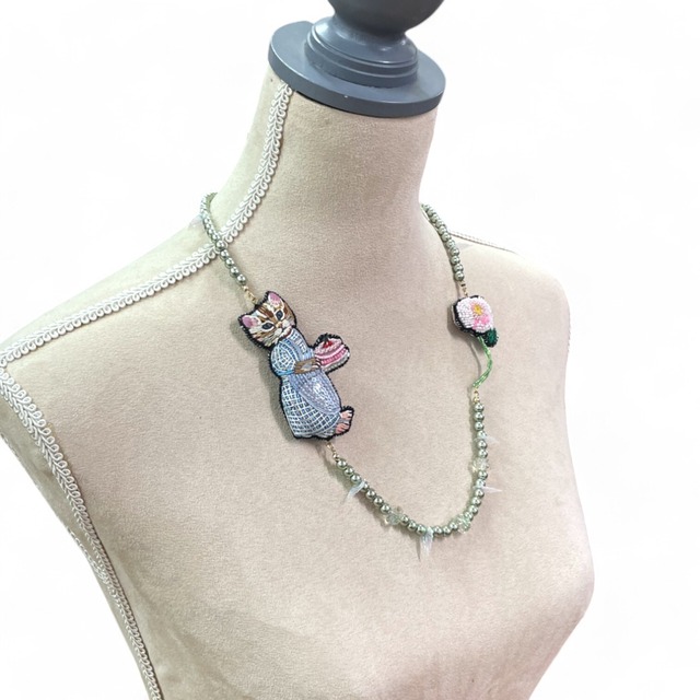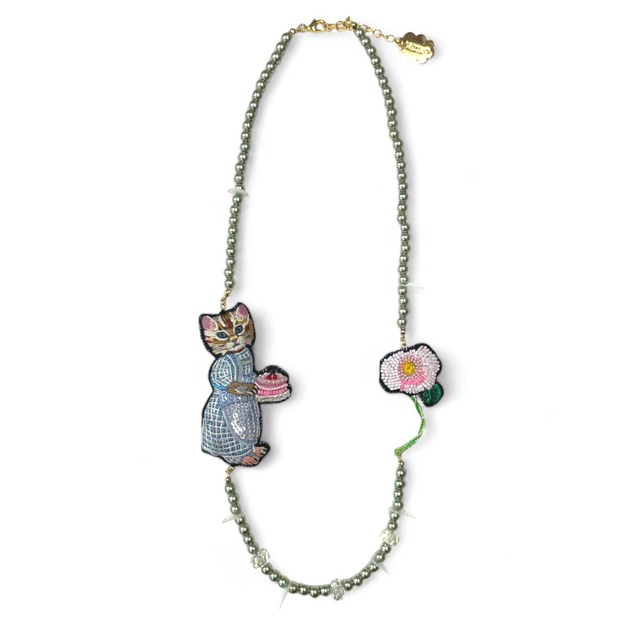 丁寧な刺繍で作られたケーキを持った猫とお花をモチーフにしたネックレス。