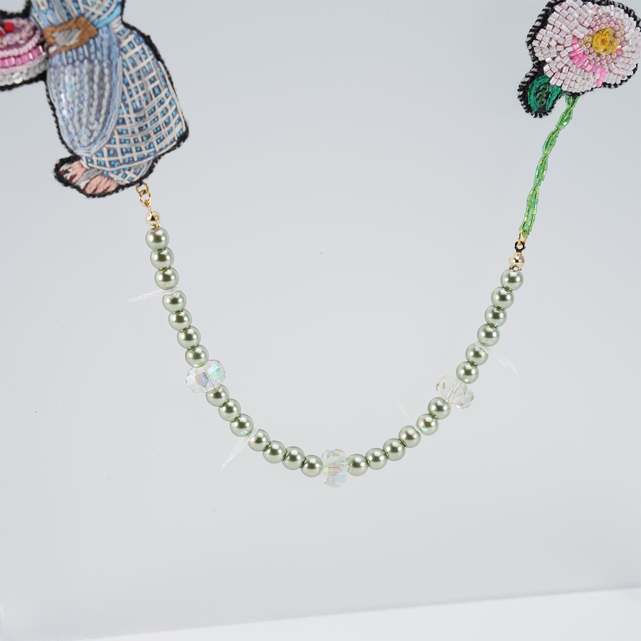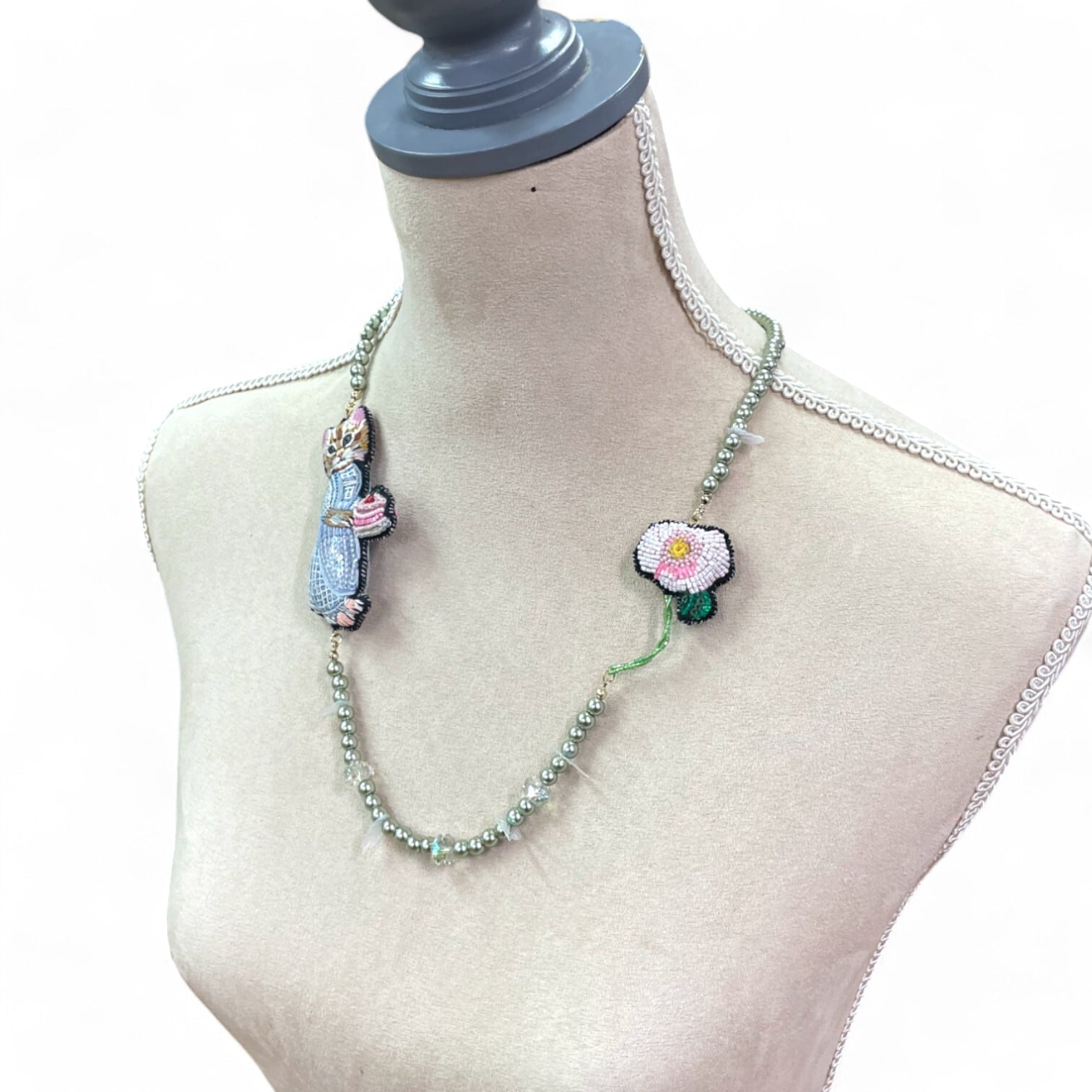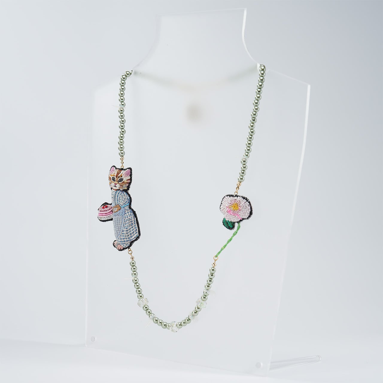 This necklace features a collaborative design with French artist Nathalie Lete, showcasing a cat holding a cake and flowers, all crafted with meticulous embroidery.
